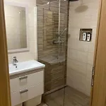 Lägenheten har ett badrum med hårtorkar, badlakan och handdukar. Det finns också en duschkabin och en separat toalett.